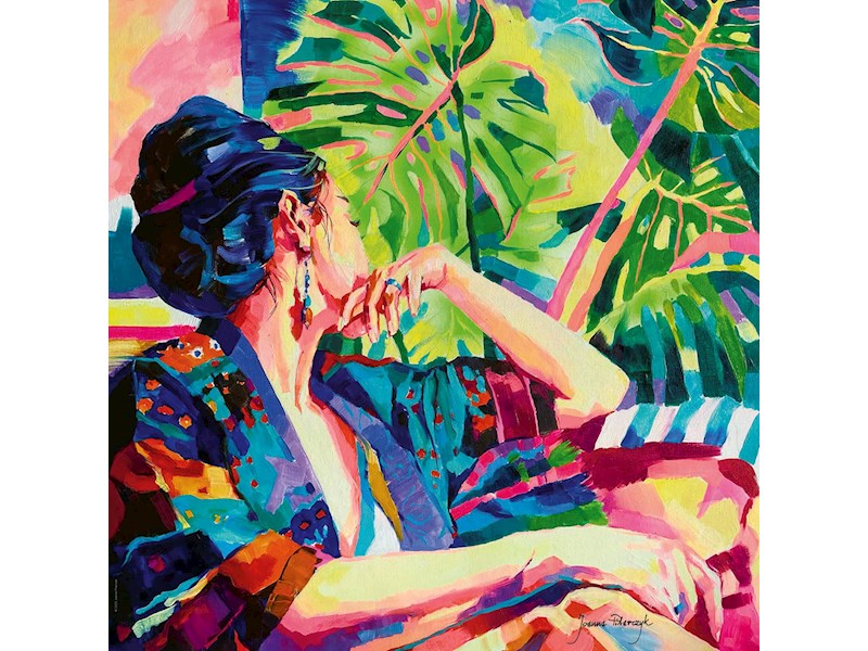 Um so entspannt zu werden wie die Frau im Motiv, puzzle man sich in ihre tagträumerische Weltflucht und -Auszeit und hat nebenbei ein erstklassiges Kopftraining. Gelegte Grösse: 56 x 56cm