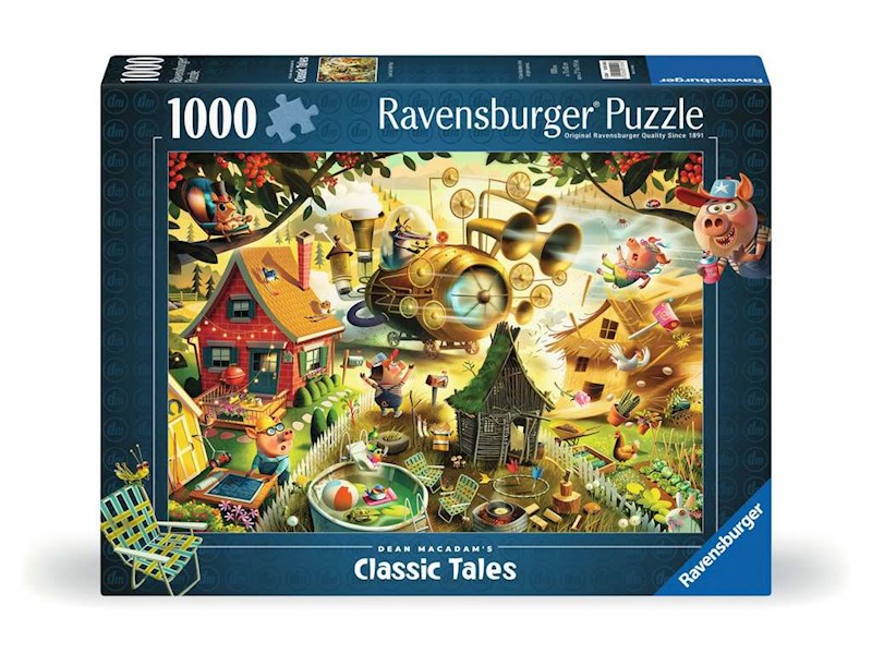 Der grosse böse Wolf treibt wieder sein Unwesen und hat den Turbo gezündet! Der Künstler Dean MacAdam hat ein weiteres berühmtes Märchen, in dem es um die drei kleinen Schweinchen geht, auf seine gewohnt schrullige Art umgesetzt. Hey Wolf, warum musstest du gehen und den tollen Tag des Hippie-Schweins stören? Das Hinterwäldlerschwein will nicht, dass der Windbeutel seine Gemütlichkeit wegpustet, während das Bauarbeiterschwein hofft, dass sein Backsteinhaus all dem Pusten und Schnaufen standhält! Verbringe schöne Stunden mit entspannendem Puzzlespass, um wieder zu Atem zu kommen!