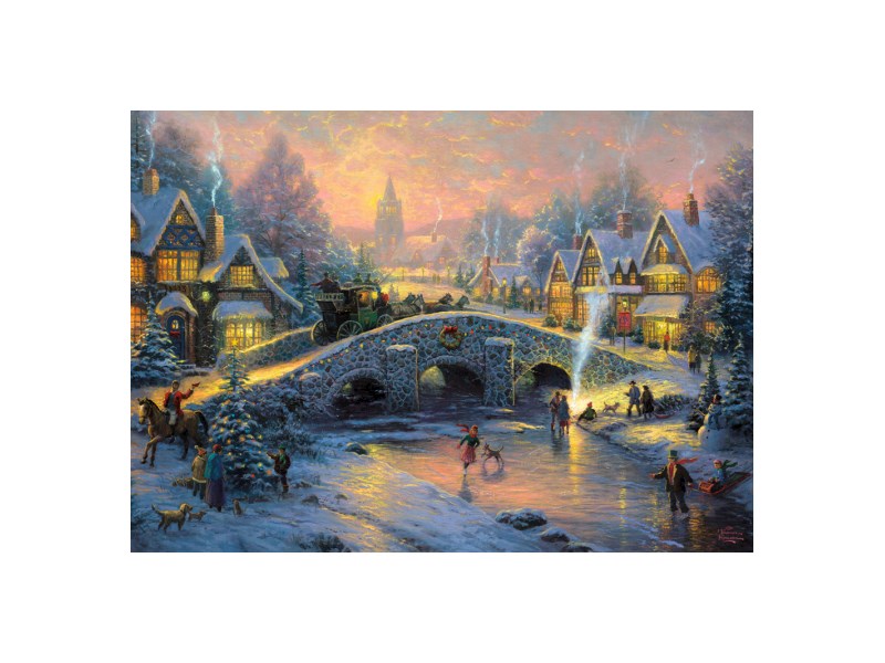 Die Poesie des Augenblicks fängt Thomas Kinkade in diesem Puzzle-Motiv von Schmidt Spiele ein. Rauchende Schornsteine, Schlittschuh-Läufer und verschneite Tannen.