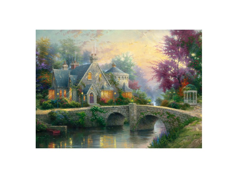 In einem kräftigen Pink blüht der Flieder in diesem Bild von Thomas Kinkade und zieht damit alle Aufmerksamkeit auf sich. Versinken Sie beim Puzzeln in eine Welt der Träume.