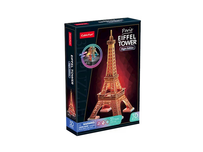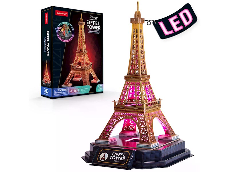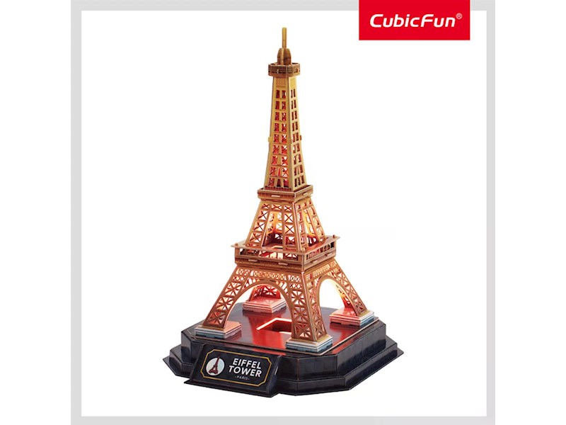 Mit diesem 3D Puzzle von CubicFun kann ohne Leim und Schere der berühmte Eiffelturm von Paris als 3D Modell nachgebaut werden. Dank der vielen bunten LED Lichter erstrahlt der Eiffelturm bei Nacht und wird zum besonderen Blickfang im Zimmer. Die bebilderte Anleitung führt Schritt für Schritt zum fertigen 3D Puzzle. Die hochwertigen Teile lassen auch mehrfaches Aufbauen zu. Batterien (3 x AAA) sind nicht im Lieferumfang enthalten. Höhe: 37cm