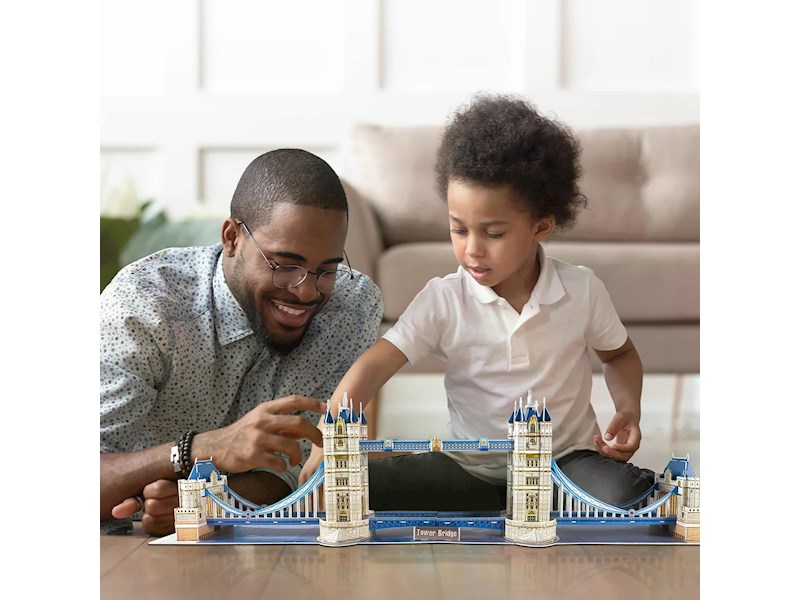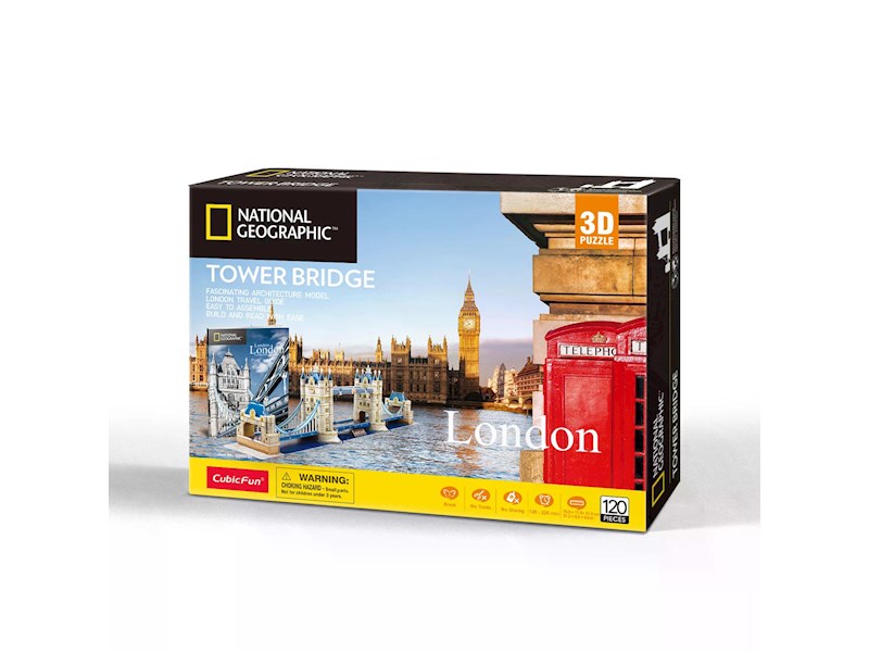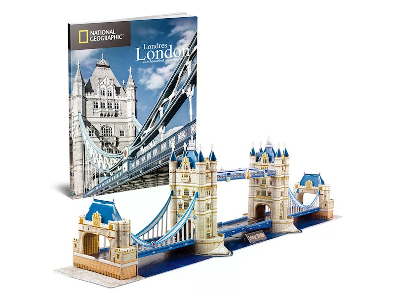 Mit diesem 3D Puzzle von CubicFun kann ohne Leim und Schere das beliebte Wahrzeichen die Tower Bridge in London als 3D Modell nachgebaut werden. Die bebilderte Anleitung führt Schritt für Schritt zum fertigen 3D Puzzle. Die hochwertigen Teile lassen auch mehrfaches Aufbauen zu. Zusammen mit dem beliegenden Heft von National Geographic wird daraus eine Reise nach London. Höhe: 21.5cm.