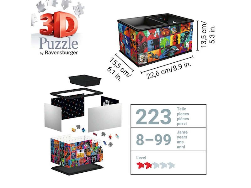 Wer dabei einmal durcheinander kommt, ist mit einem Blick auf die bebilderte Aufbauanleitung schnell wieder auf dem richtigen Weg. Die stabilen 3D Puzzleteile sind teilweise knickbar und für ein leichteres Zusammensetzen nummeriert. So vergeht die Puzzlezeit wie im Flug und schon bald steht die Box als Hingucker in deinem Zimmer. Eine spielerische Konzentrationsübung für Anfänger sowie für Puzzleprofis – dank der Kunststoff-Zubehörteile ist die Aufbewahrungsbox absolut stabil und so richtig geräumig.