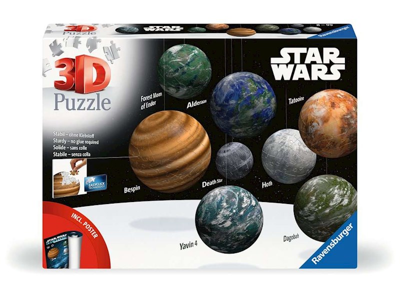 Die Star Wars Galaxis mag weit, weit entfernt von uns sein, aber jetzt kann sich jeder Fan einige der berühmtesten Himmelskörper der Weltraum-Saga nach Hause holen und in 3D zusammenpuzzeln. Die einzelnen Puzzle-Bälle sind separat verpackt und die Teile auf den Rückseiten nummeriert, so dass sowohl Einsteiger als auch erfahrene 3D Puzzler ihren Spass haben werden.