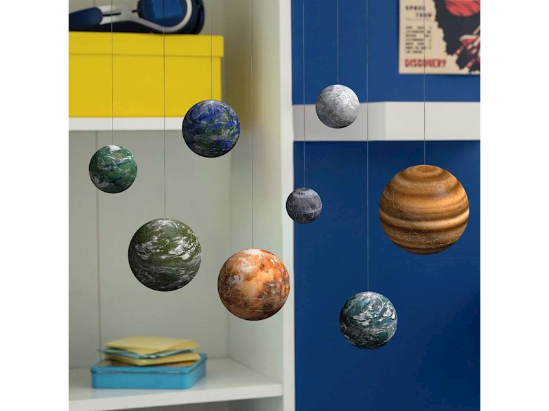 Die Planeten können auf den beigefügten Standies (Stehfüssen) im Regal platziert oder mit der ebenfalls enthaltenen Nylonschnur aufgehängt werden.
