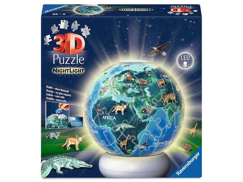 Dieser dekorative Tierglobus wird zum stimmungsvollen Nachtlicht, sobald der dimmbare Leuchtsockel den 3D Puzzle-Ball von innen erstrahlen lässt. Die perfekte Einschlafhilfe für alle Weltentdecker! Dabei ist die coole kleine Lampe so kinderleicht zu bedienen wie eine Touch Lampe. Sie verfügt über zwei Helligkeitsstufen und funktioniert kabellos mit Batterien oder über den integrierten USB-C-Anschluss. Das besondere Geschenk für alle puzzlebegeisterten Mädchen und Jungen ab 6 Jahren.