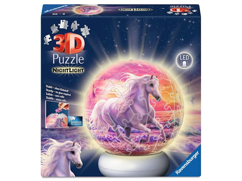 Reiten in den Sonnenuntergang: Dieser 3D Puzzle-Ball mit zauberhaftem Pferdemotiv verwandelt sich in ein stimmungsvolles Nachtlicht, sobald der dimmbare Leuchtsockel den Ball von innen erstrahlen lässt. Dabei ist die coole kleine Lampe so kinderleicht zu bedienen wie eine Touch Lampe. Sie verfügt über zwei Helligkeitsstufen und funktioniert kabellos mit Batterien oder über den integrierten USB-C-Anschluss. Das besondere Geschenk für alle puzzlebegeisterten Mädchen und Jungen ab 6 Jahren.