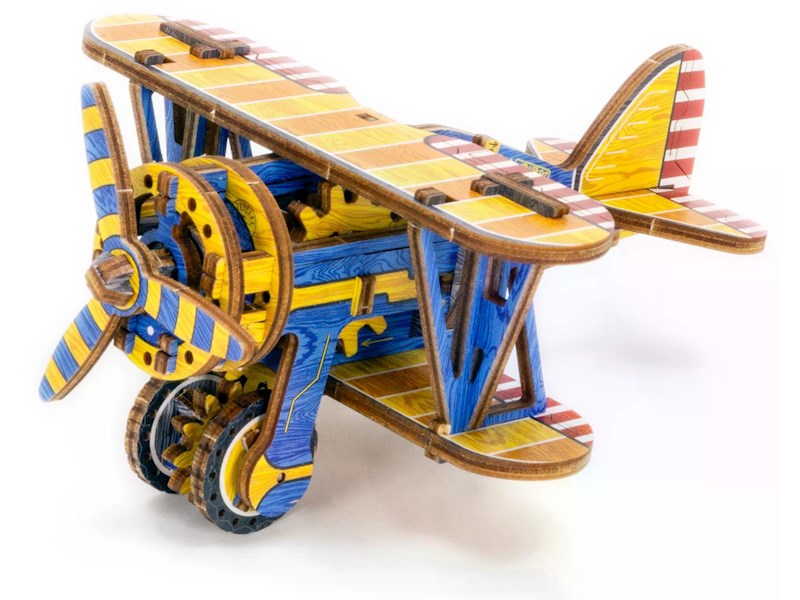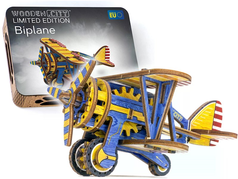 Die Freiheit über den Wolken ruft! Das Wooden City 3D Biplane ist ein Klassiker der Luftfahrt und ein Holzflugzeugmodell mit einem Gummimotor, Rädern und einem sich drehenden Propeller!