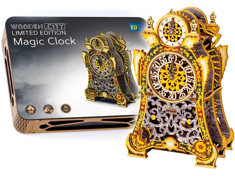Diese Uhr ist nicht nur ein 3D-Puzzle, sondern sie funktioniert auch. Sie hat zwei Zifferblätter - eines für die Stunden und eines für die Minuten -, ein Uhrwerk und ein Pendel. Nach einmal Aufziehen läuft sie etwa 30 Minuten lang.
