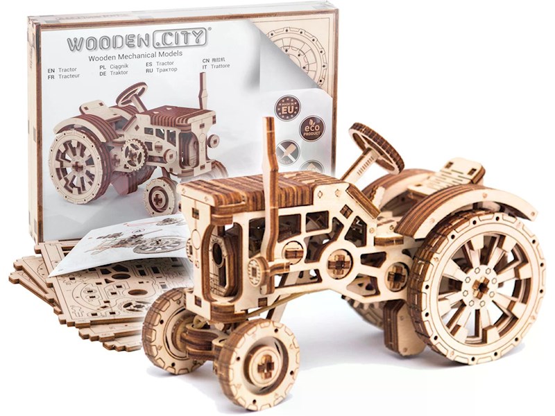 Der Traktor kann von Vorwärts- auf Rückwärtsfahrt umgestellt werden. Funktionierende Lenkung, die Motorhaube kann geöffnet werden. Der Kolben bewegt sich vor und zurück. Bausatz aus gelaserten Holzteilen, ohne Klebstoff.