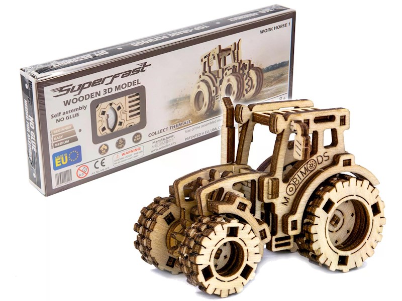Dieses Work Horse Modell ist eine Nachbildung des legendäre Traktors Fendt 210. Bau den Traktor aus Holz, ganz ohne Klebstoff, zusammen und veranstalte ein Rennen auf dem Bauernhof.