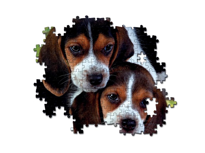 Die beiden süssen Beaglewelpen kuscheln sich eng aneinander. Die Geschwister haben sich sichtlich lieb und geben ein treuherziges Motiv zum Puzzeln ab.
