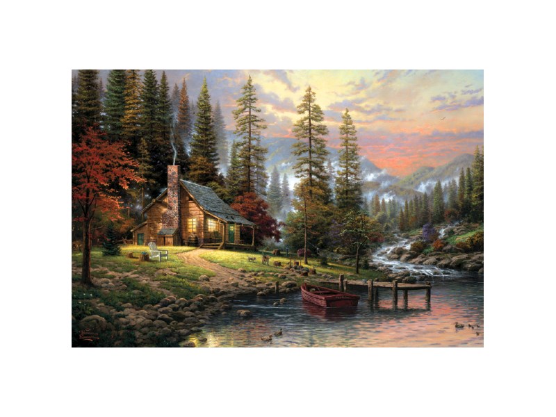 Am Rande eines Bergsees steht eine kleine Hütte, aus deren Schornstein weisser Rauch aufsteigt. Ein Bild, das zum Träumen einlädt und die Sorgen des Alltags vergessen macht.