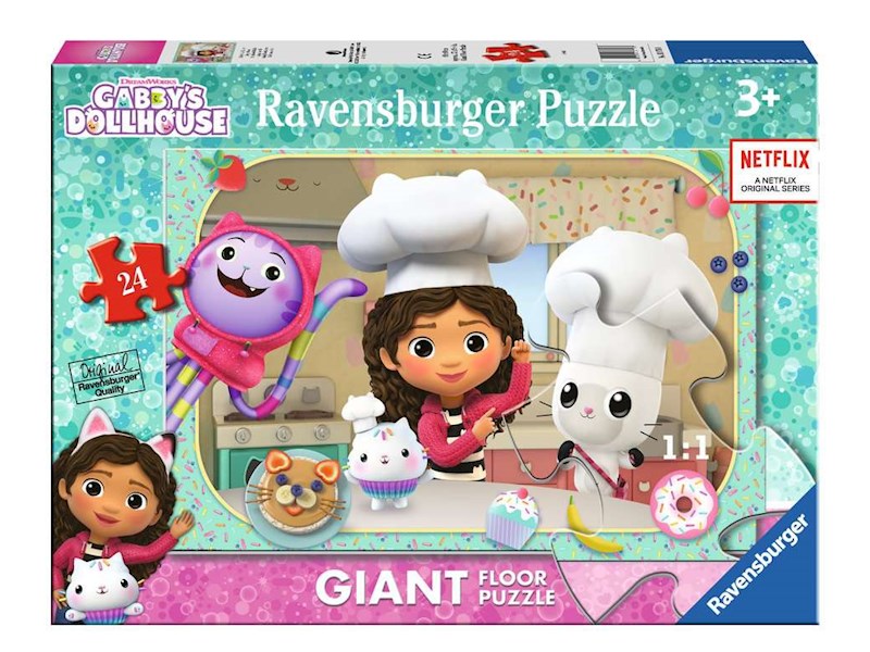 Ravensburger Giant Floor Puzzles – Puzzlespass im Grossformat! Aus 24 extra grossen und stabilen Puzzleteilen entsteht ein tolles Motiv aus der beliebten Kinderserie „Gabby's Puzzlenhaus“ im Format 69 x 49 cm. Stück für Stück können Kinder ab 3 Jahren in Gabbys Welt eintauchen und dabei spielerisch Konzentration und Feinmotorik trainieren. Giant Floor Puzzles machen allein und gemeinsam Spass.