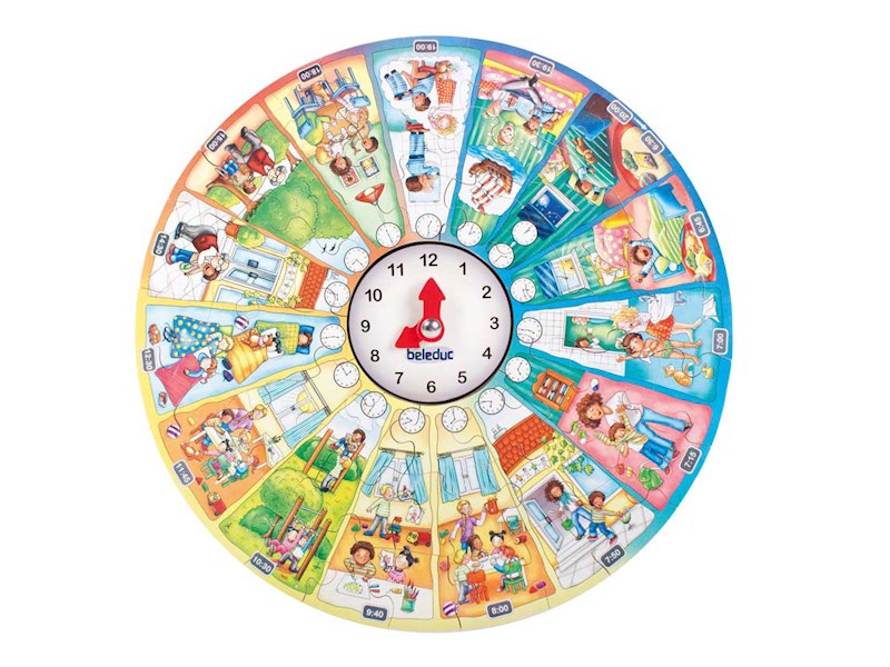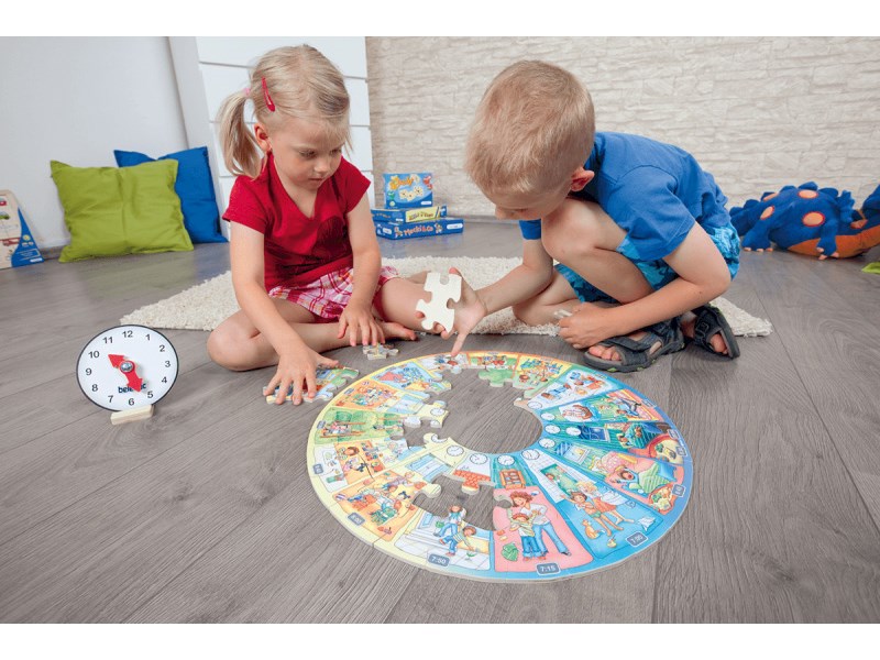 Das Lernpuzzle 'Mein Tag' begleitet die Kinder durch ihren Tagesablauf und führt sie auf spielerische Weise an die Uhrzeit heran. Anhand des Puzzles lassen sich vertraute Abläufe erkennen und benennen. Ganz nebenbei wird die Sprachentwicklung gefördert.
