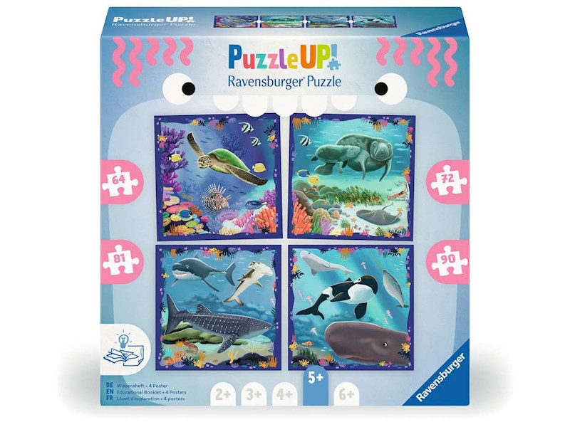 Die Puzzlebilder zeigen faszinierende Meerestiere wie Haie und Wale, im Wissensheft gibt es spannende Informationen dazu. Am Ende ergeben die 4 Puzzles ein grosses Gesamtbild, sie können als Quadrat oder in einer Reihe angeordnet werden.