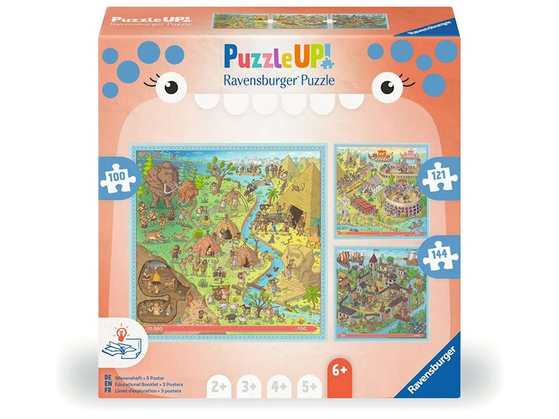 Die quadratischen Puzzles mit unterschiedlichen Teilezahlen zeigen die Steinzeit, das alte Rom und das Mittelalter. Im Wissensheft gibt es spannende Informationen dazu. Am Ende ergeben die 3 Puzzles ein grosses, dekoratives Gesamtbild.